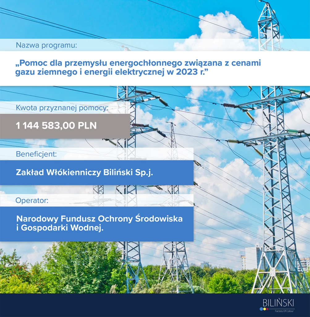 Zakład Włókienniczy Biliński Sp. J. informs that it has received aid under the government program “Aid for energy-intensive sectors due to prices of natural gas and electricity in 2023.”